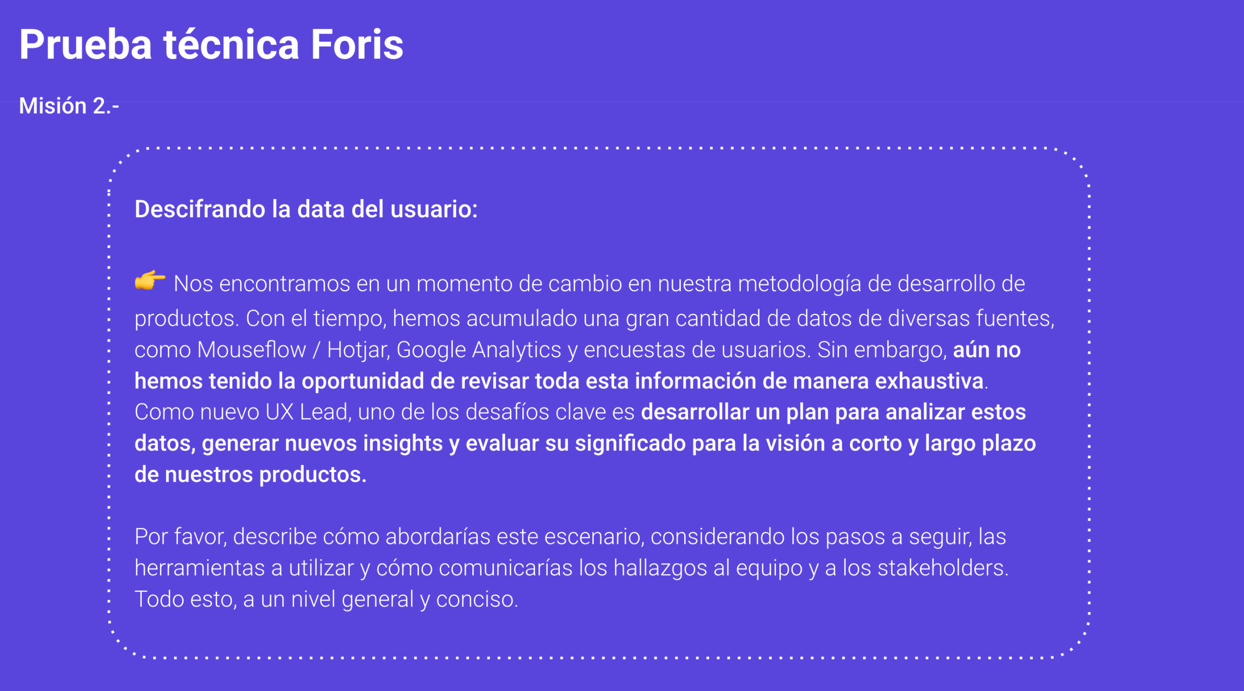 Como nuevo UX Lead, recibo un ecosistema de datos subutilizado (Hotjar, Google Analytics, encuestas), sin análisis sistemático. Se espera que estructure un plan para convertir esa data en insights de producto.