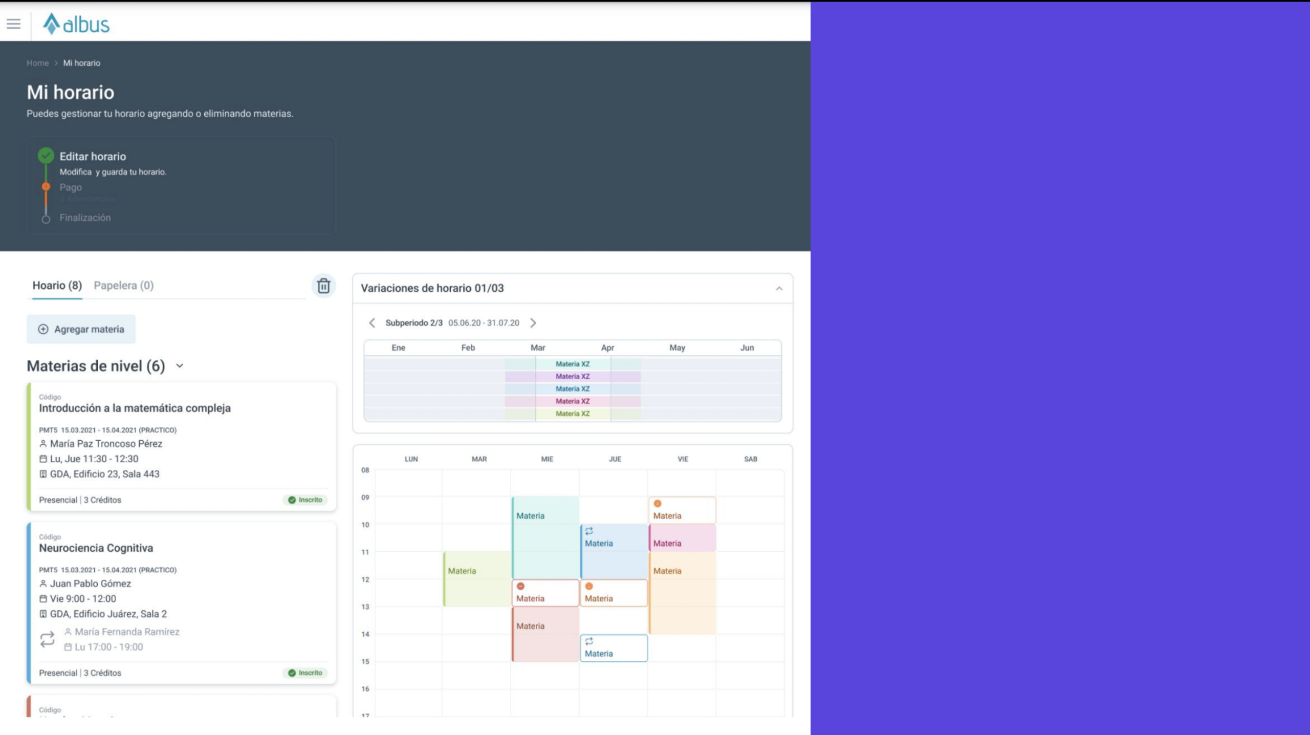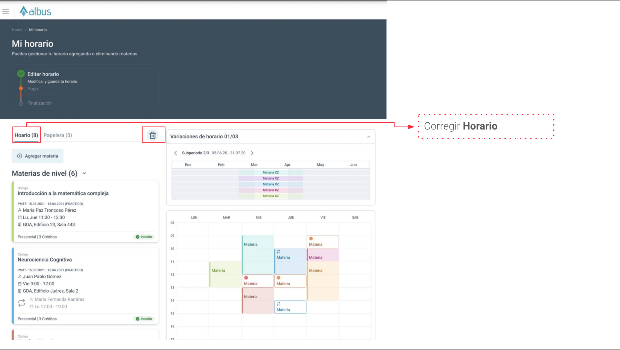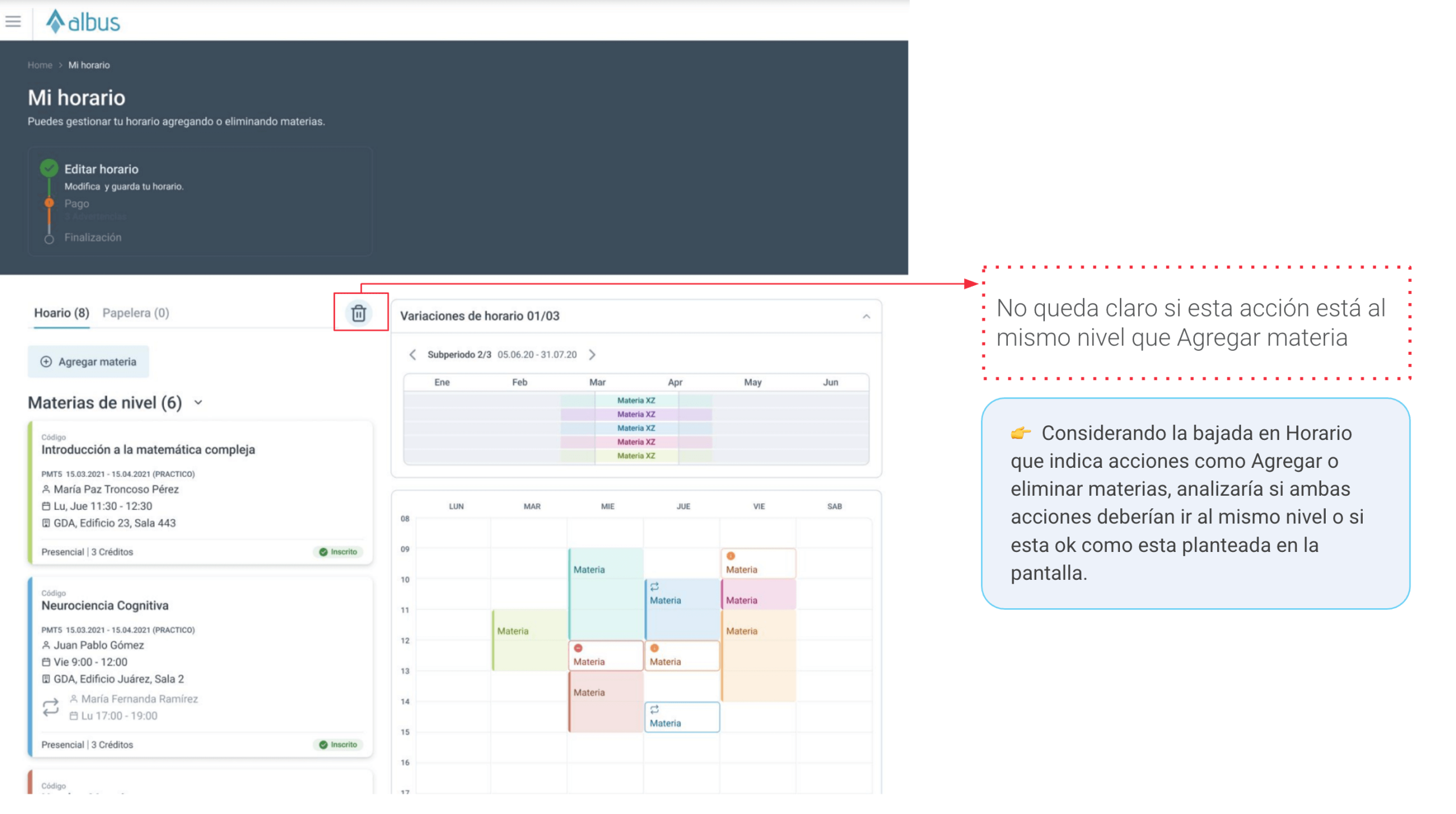 Claridad de acciones: revisar alineación de acciones como "Agregar" o "Eliminar materia" para facilitar el flujo del usuario.